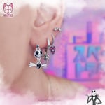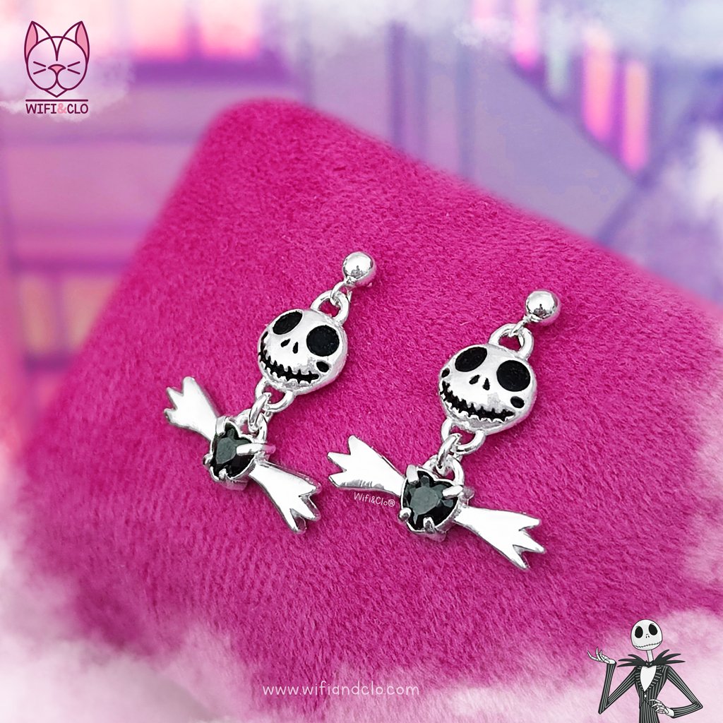 These sterling silver 925 earrings are inspired by Jack Skellington from The Nightmare Before Christmas by Tim Burton, featuring two black heart-shaped zirconia stones.