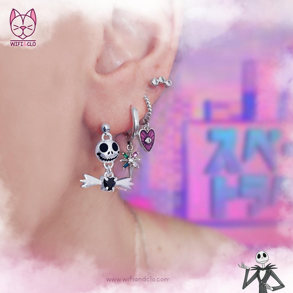 Estos pendientes de plata de ley 925 están inspirados en Jack Skellington de El Extraño Mundo de Jack de Tim Burton, y cuentan con dos circonitas en forma de corazón en color negro, aportando un toque elegante y misterioso.