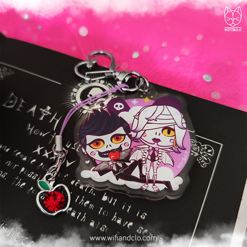 5 cm acrylic keychain inspired by the shinigamis Ryuk and Rem from Death Note, illustrated in a kawaii style. 100% exclusive designs illustrated by me, making it a truly unique accessory.