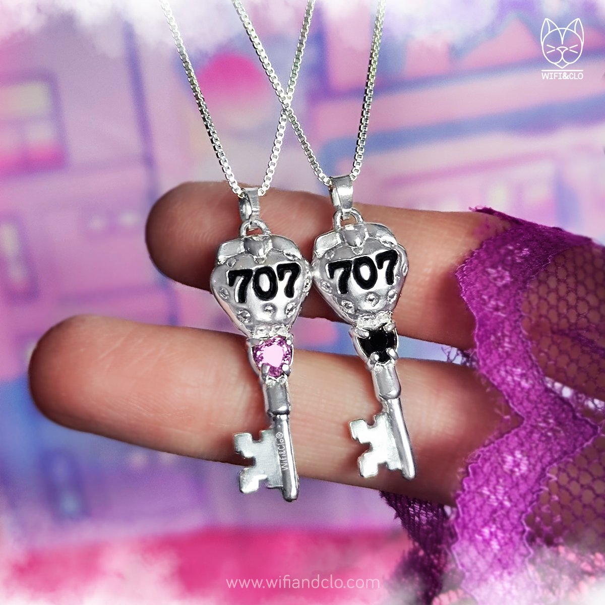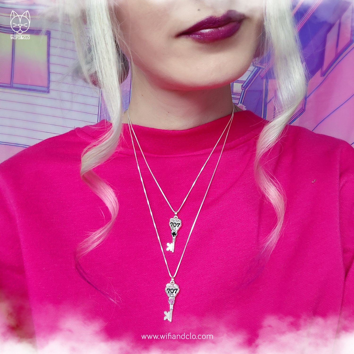 Collar de plata de ley 925, diseñado y elaborado a mano en mi taller, inspirado en la llave del apartamento 707 del anime y manga Nana de Ai Yazawa. Combina el encanto del anime con una simpática fresa y una circonita en talla corazón, disponible en rosa o negro, según con qué Nana te identifiques.