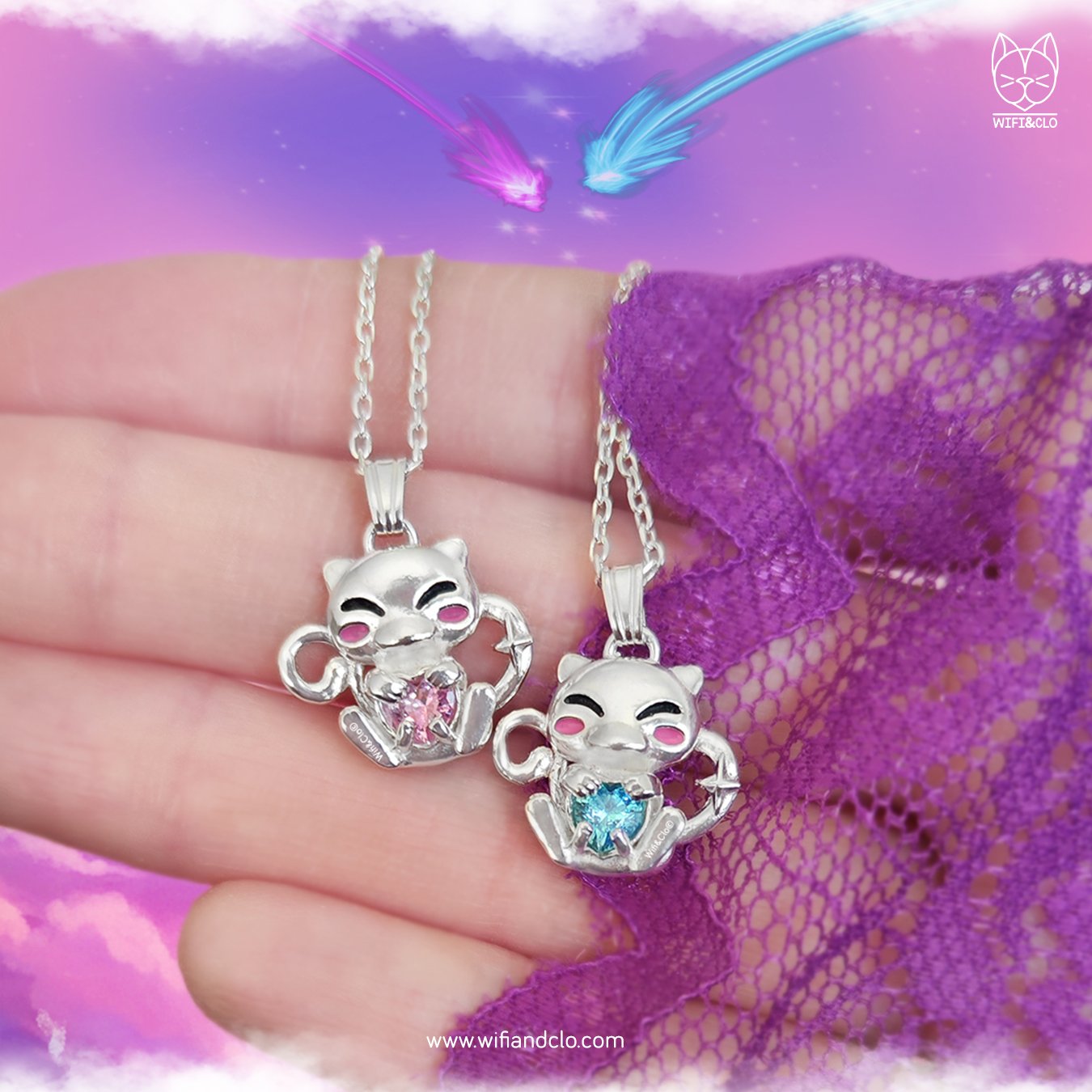 Handmade 925 Sterling Silver necklace with an exclusive kawaii Wifi&Clo® design, inspired by Mew, the Pokémon soaring the skies. Features a heart-shaped zirconia (pink for original Mew or blue for shiny version) and includes the “Your Mew” illustration by artist Evi Hashirart, fusing the collection elements in the cutest kawaii way. The pendant has front and back details, including its elegant tail.